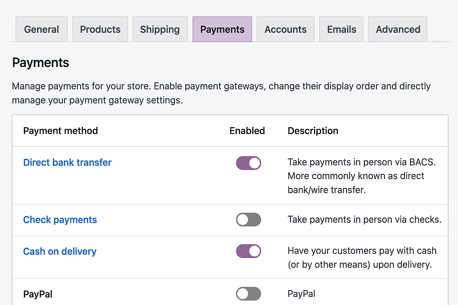 Acesse a aba Pagamentos Na página de configurações do WooCommerce, clique na aba Pagamentos para gerenciar os métodos de pagamento.