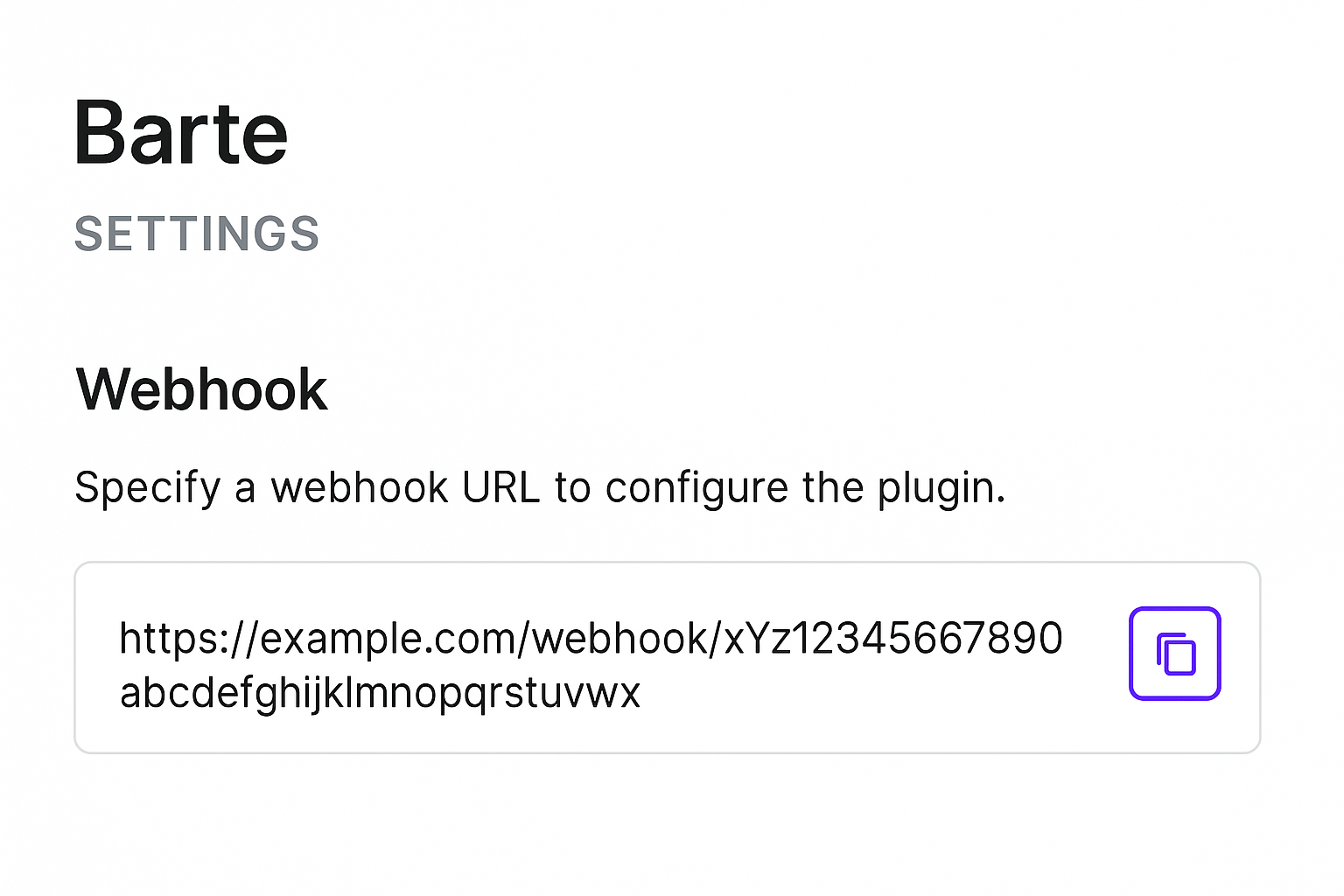 O plugin exibirá uma URL de webhook que você precisa configurar no painel da Barte. Para configurar: